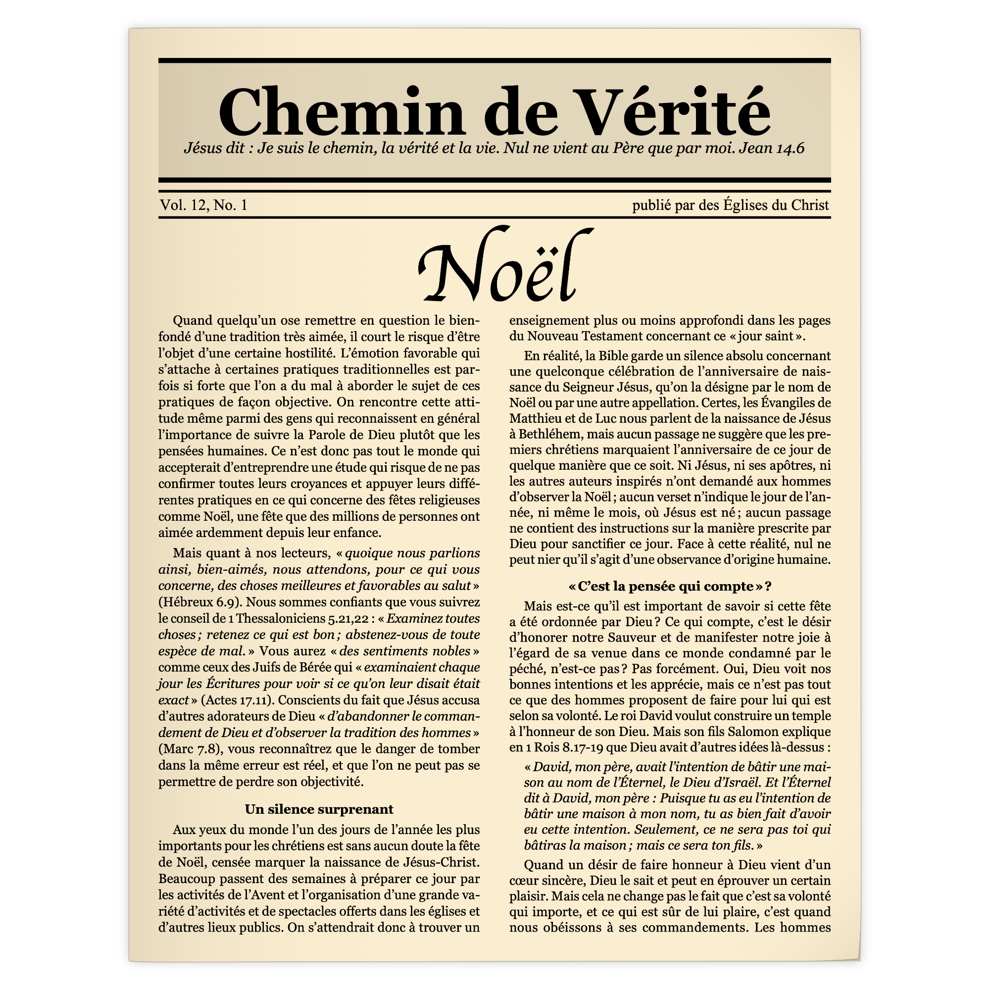 Quand quelqu’un ose remettre en question le bien-fondé d’une tradition très aimée, il court le risque d’être l’objet d’une certaine hostilité. L’émotion favorable qui s’attache à certaines pratiques traditionnelles est parfois si forte que l’on a du mal à aborder le sujet de ces pratiques de façon objective. On rencontre cette attitude même parmi des gens qui reconnaissent en général l’importance de suivre la Parole de Dieu plutôt que les pensées humaines. Ce n’est donc pas tout le monde qui accepterait d’entreprendre une étude qui risque de ne pas confirmer toutes leurs croyances et appuyer leurs différentes pratiques en ce qui concerne des fêtes religieuses comme Noël, une fête que des millions de personnes ont aimée ardemment depuis leur enfance.