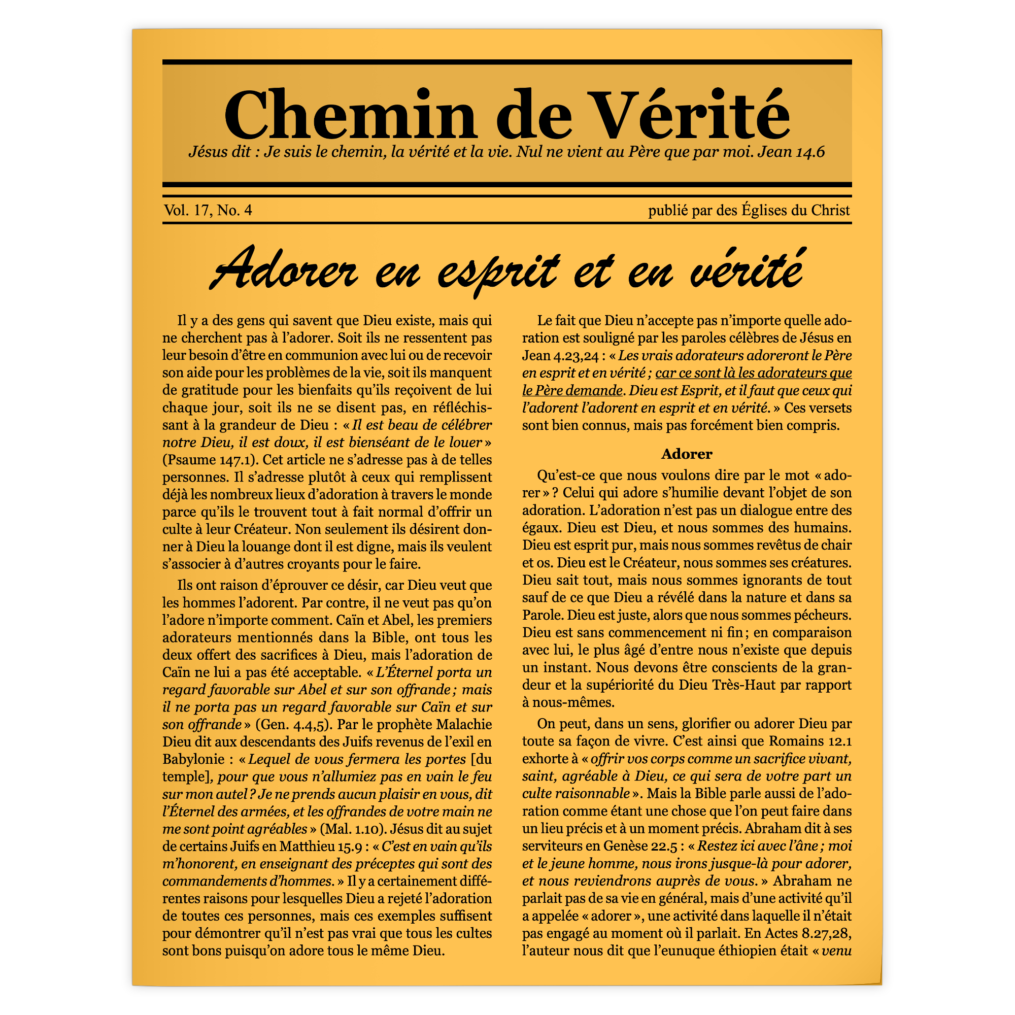 Qu’est-ce que l’adoration et pourquoi devrait-on adorer Dieu ? La Bible nous dit-elle comment il faut adorer, ou bien Dieu accepte-t-il n’importe quel culte, pourvu qu’il soit offert avec sincérité ? Quels sont les éléments d’un culte chrétien selon le Nouveau Testament ? Voilà quelques-unes des questions abordées dans ce numéro de Chemin de Vérité.
