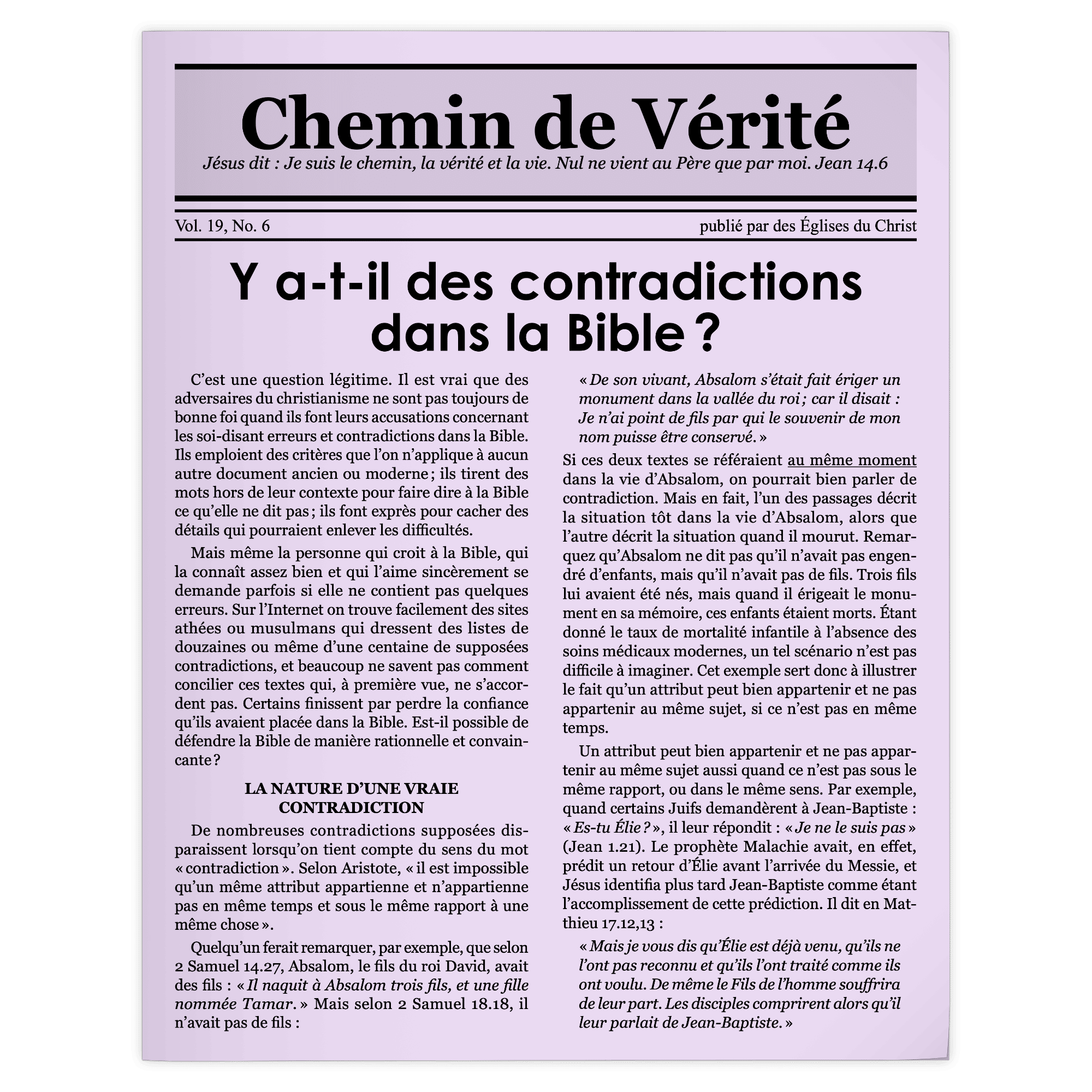 Beaucoup qui doutent de l’inspiration de la Bible soulignent des erreurs et contradictions apparentes qu’ils croient trouver dans ses pages. Même des croyants sont parfois troublés par des passages qu’ils ont du mal à concilier. Dans ce numéro nous essayons de montrer comment résoudre différentes sortes de problèmes de ce genre afin que le lecteur sache que des explications plausibles existent et qu’il ait toujours confiance à la fiabilité de la Bible.