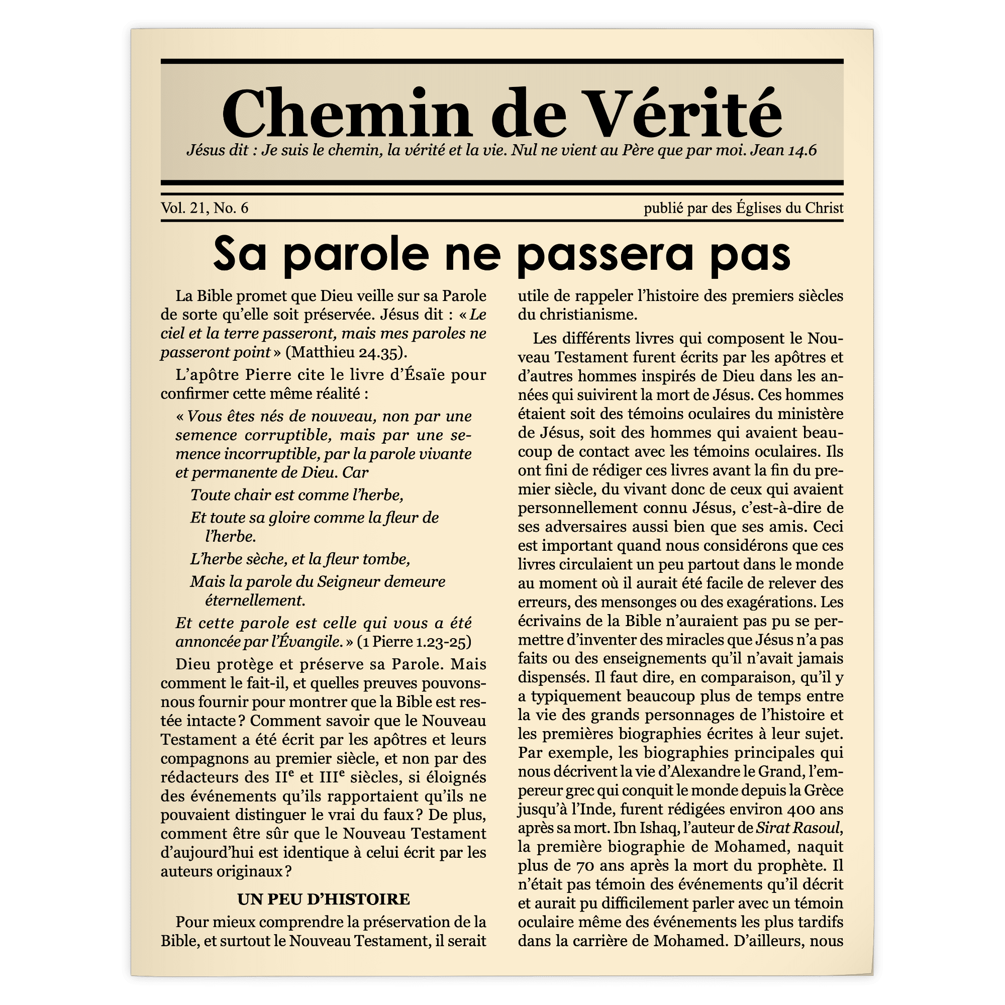 Certains suggèrent que la Bible a été corrompue et qu’elle ne contient pas le récit authentique de Jésus et des débuts de son Église. Leurs affirmations sont sans preuve. Ce numéro de Chemin de Vérité explique pourquoi le croyant peut avoir pleine confiance que le Nouveau Testament a été écrit par les apôtres et leurs compagnons au premier siècle et que leurs écrits ont été bien préservés au cours des siècles.