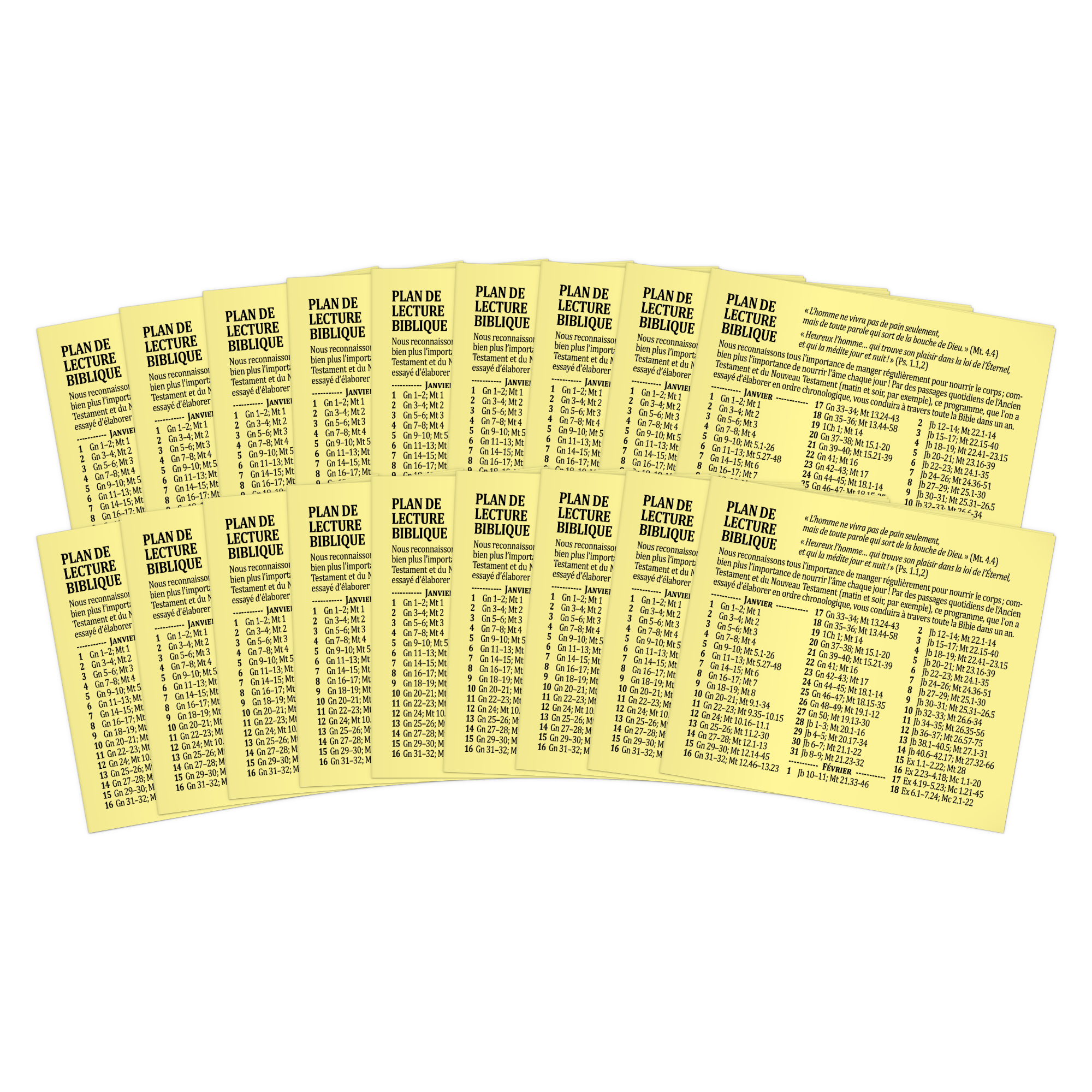 Un plan de lecture biblique plus ou moins en ordre chronologique. La lecture de chaque jour comprend des passages de l’Ancien Testament aussi bien que du Nouveau Testament. En petit format pour garder dans sa Bible ou pour distribuer.