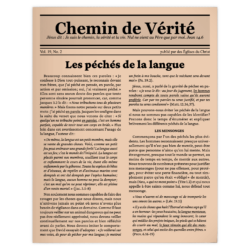 UGS : CV19-N2 | par Barry BAGGOTTNous savons tous qu’il est possible de pécher en parole, mais pouvons-nous éviter les péchés de la langue si nous ne sommes pas capables de les identifier ? Dans ce numéro nous examinons brièvement les différents péchés de la langue condamnés dans la Parole de Dieu, tels que les mensonges, les insultes, la calomnie, le blasphème, les paroles grossières, et d’autres.